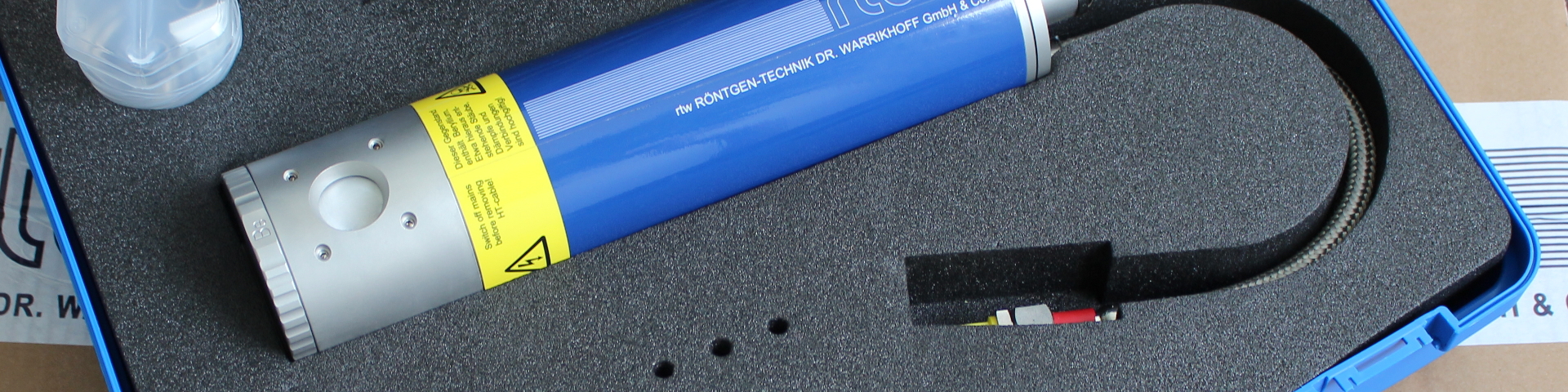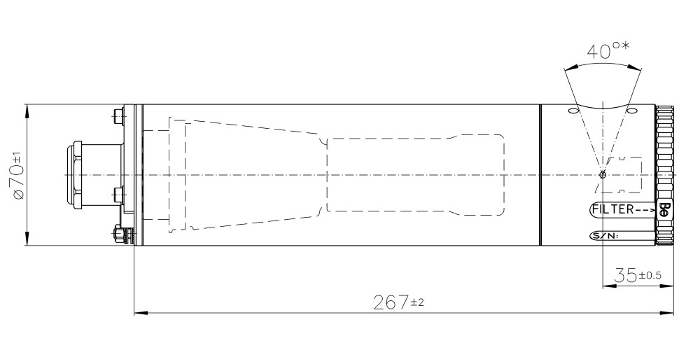 Our MCD series is based on the traditional tube design for anode grounded X-ray tubes. Therefore the cathode is on the HT side and needs to have negative polarity and additionally the filament supply on HT. These X-ray tubes are electrostatic focalized only and provide high power X-ray output, starting from 20 kV to 75 kV and 100 kV applications. These tubes are made mainly for the non destructive testing purposes, but equipped with different target materials, they are commonly used in X-ray analytical applications too. The HT cable can be glued in for a maintenance free usage at the enduser side with very flexible HT cables up to 75 kV (up to 100 kV on special request). Standard cables with an R24 cone can be inserted directly into the tube receptacle. For long time X-ray emission stability the full tube body is cooled and the anode can be powered up up to 3 kW. The radiation shielding made of lead free materials is already built in and a rotational anode cup provides three adjusting filter positions for e.g. 3 mm aluminum, 3 mm lead for shielding or with none for using the soft X-rays only filtered by the inherent BE window. The emission angles are custom made and can be machined for fan beam applications 60° x 10° or for cone beam e.g. 40° x 40°. The focal spot in this family ranges from 5, 3, 2, 1,5, 1, 0,7, 0,5 mm. The cathode system allows 2 separate focal spots in one tube for switching e.g. from high resolution imaging to high power imaging.