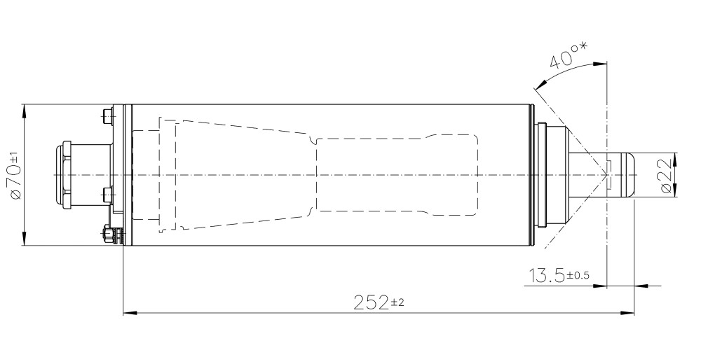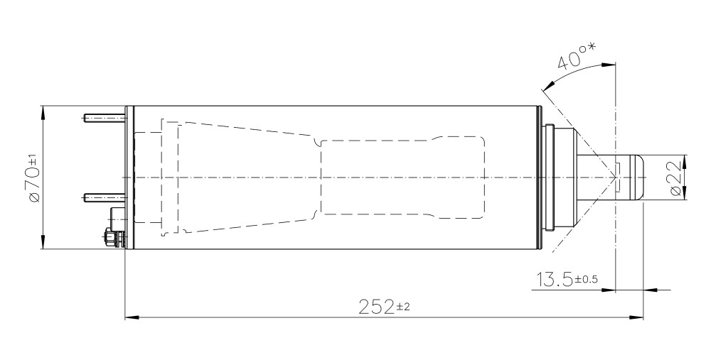 The MCR is a specially designed anode grounded X-ray tube for panoramic applications. Therefore the cathode is on the HT side and needs to have negative polarity and additionally the filament supply on HT. These X-ray tubes are electrostatic focalized only. X-ray output is starting from 75 kV to 120 kV applications. These tubes are made mainly for the non destructive testing purposes. The HT cable can be glued in for a maintenance free usage at the endusers side with very flexible HT cables up to 75 kV (up to 100 kV on special request). Standard cables with an R24 cone can be inserted directly into the tube receptacle. For long time X-ray emission stability the full tube body is water-cooled and the anode can be powered up to 800 W. The radiation shielding made of lead free materials is already built in. The emission angles are custom made and can be machined.